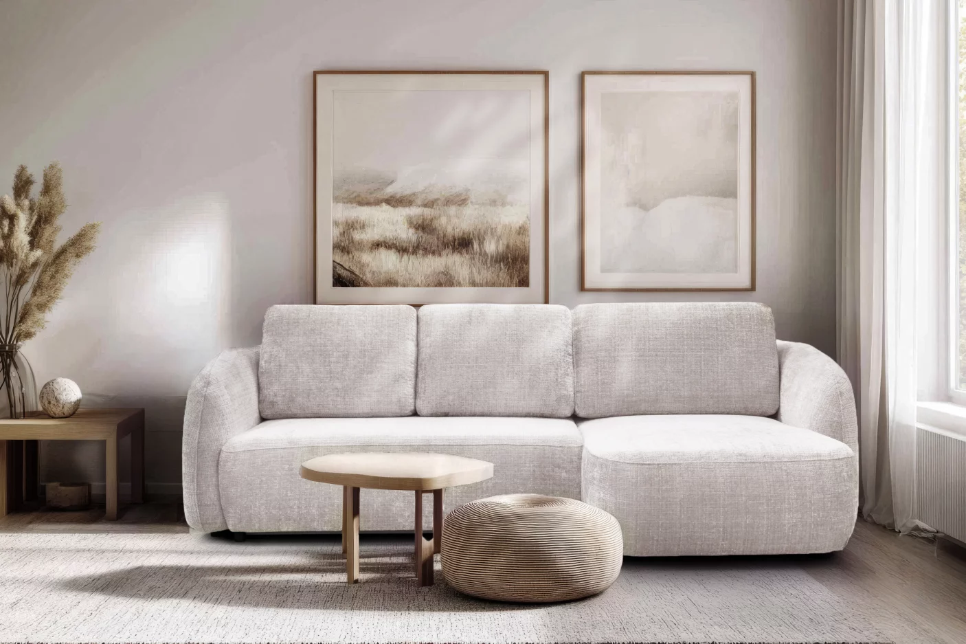 Оббивка виконана з тканини Raven 22— це високоякісна оббивна тканина з виразним тривимірним (3D) ефектом та м'яким, надзвичайно приємним на дотик покриттям, що нагадує букле або шерсть. Вона ідеально підходить для оббивки диванів завдяки поєднанню елегантності та високої довговічності.