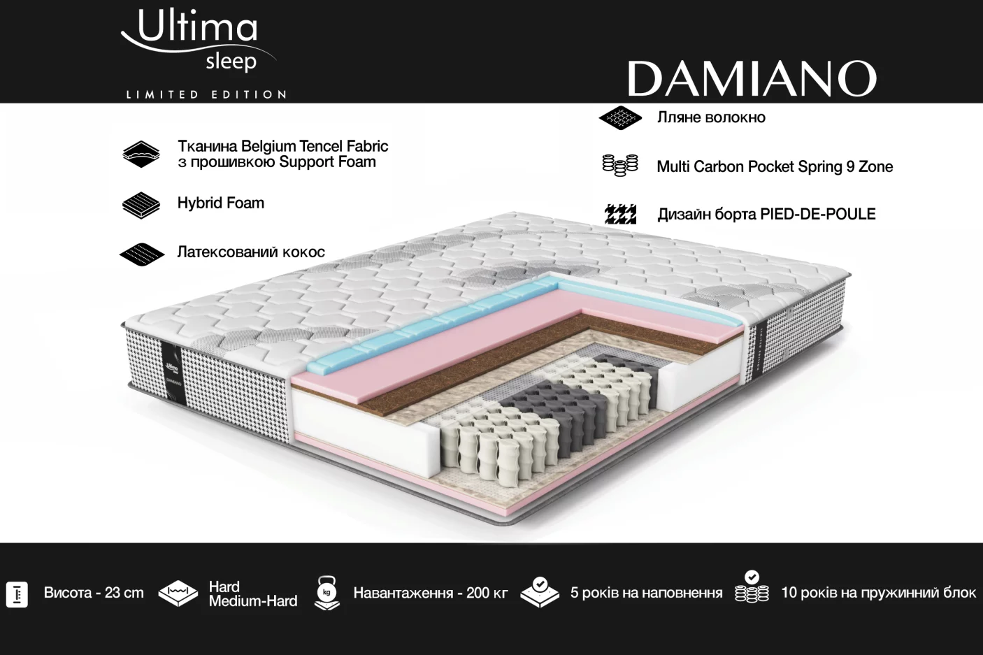 Чохол з тканини Belgium Tencel Fabric з прошивкою Support Foam додає елегантності та ніжності на дотик, а декоративний бортик з орнаментом Pied-de-poule підкреслює стильний і преміальний вигляд матраца.