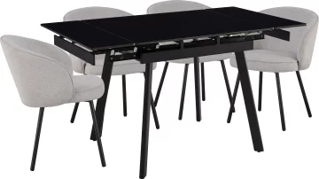 Оригінальний та лаконічний силует обіднього столу виражений глянцевою прямокутною стільницею неймовірно вишуканого відтінку, розташованою на чотирьох фігурних ніжках, які розходяться, немов промені, від кожного кута.