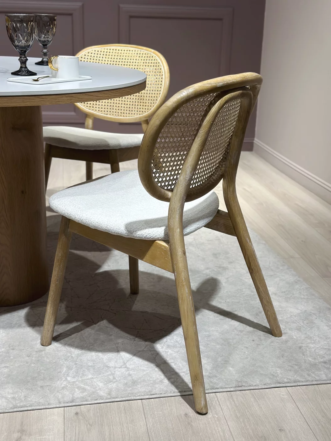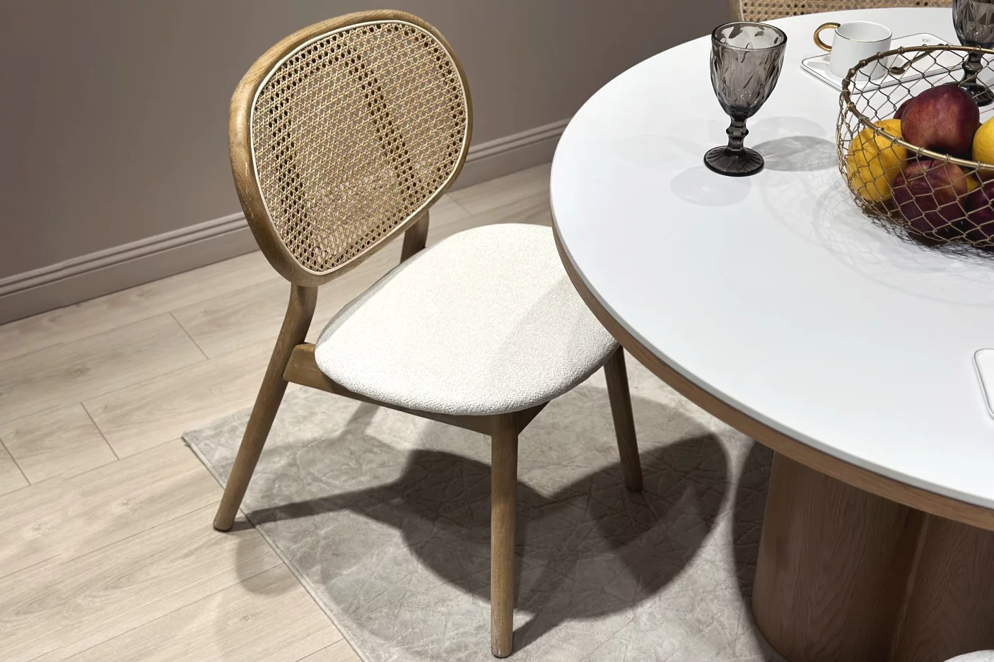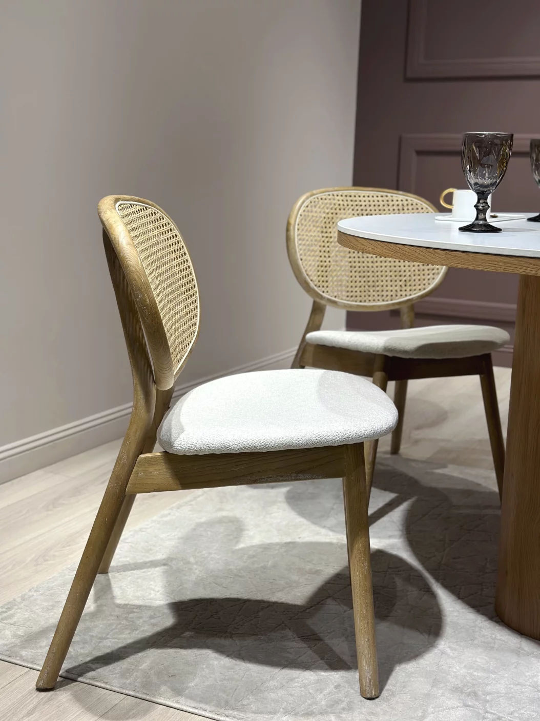 Сидіння с подушкою, оббитою тканиною, забезпечує неперевершений комфорт, додаючи елегантного акценту всій композиції. Розроблений з урахуванням вашого комфорту та естетики, обідній стілець Elegant стає невід’ємним елементом кожної їдальні, заохочуючи вас їсти разом у приємній атмосфері.