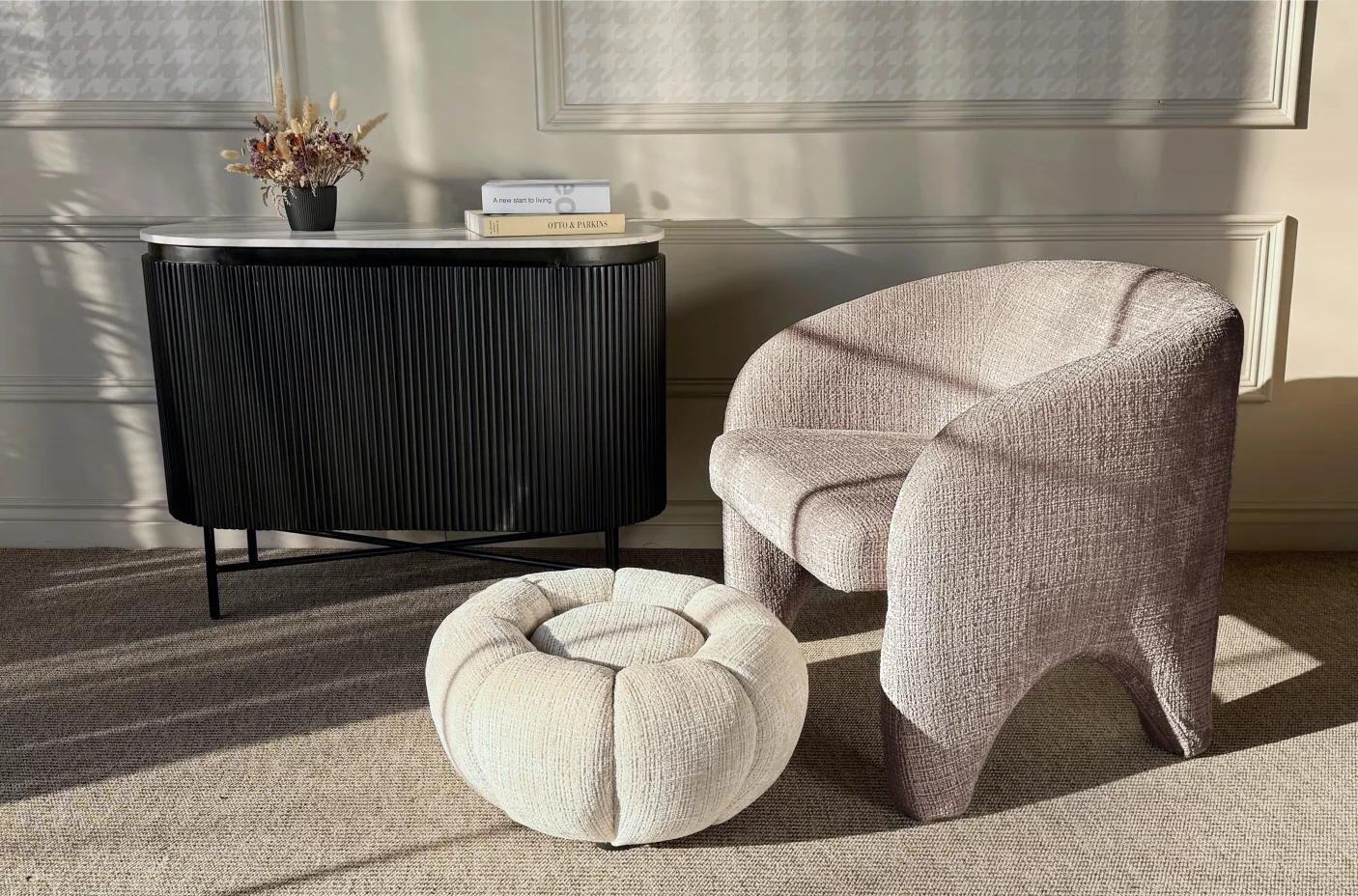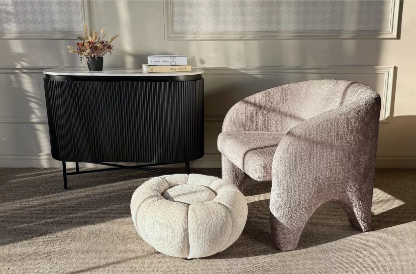 Оббивка з м'якої та зносостійкої тканини шеніл є не тільки естетичним доповненням до приголомшливого дизайну, а ще й гарантує задоволення на дотик. М'яке сидіння і спинка забезпечують відмінну підтримку спини, створюючи ідеальні умови для відпочинку. Незвичні широкі ніжки, також ообиті шенілом, стають цікавим штрихом силуету.
