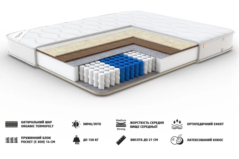 Пружинний блок, латексована кокосова стружка, термовойлокСтупінь жорсткості