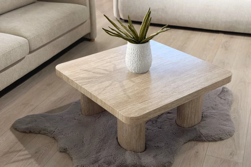 Простий та лаконічний силует кавового столику складається з квадратної стільниці та чотирьох циліндричних ніжок, виготовлених з травертину. Така конструкція забеспечує стійкість та стабільність столику, водночас з мобільністю, обумовленою легкістью цього пористого вулканічного матеріалу.