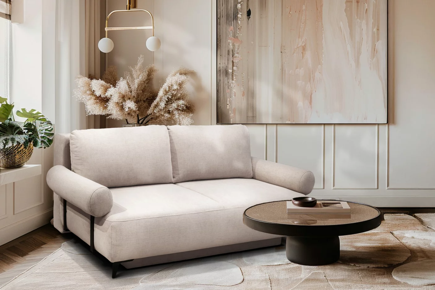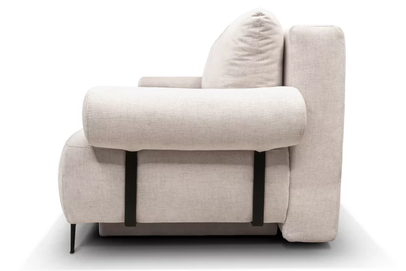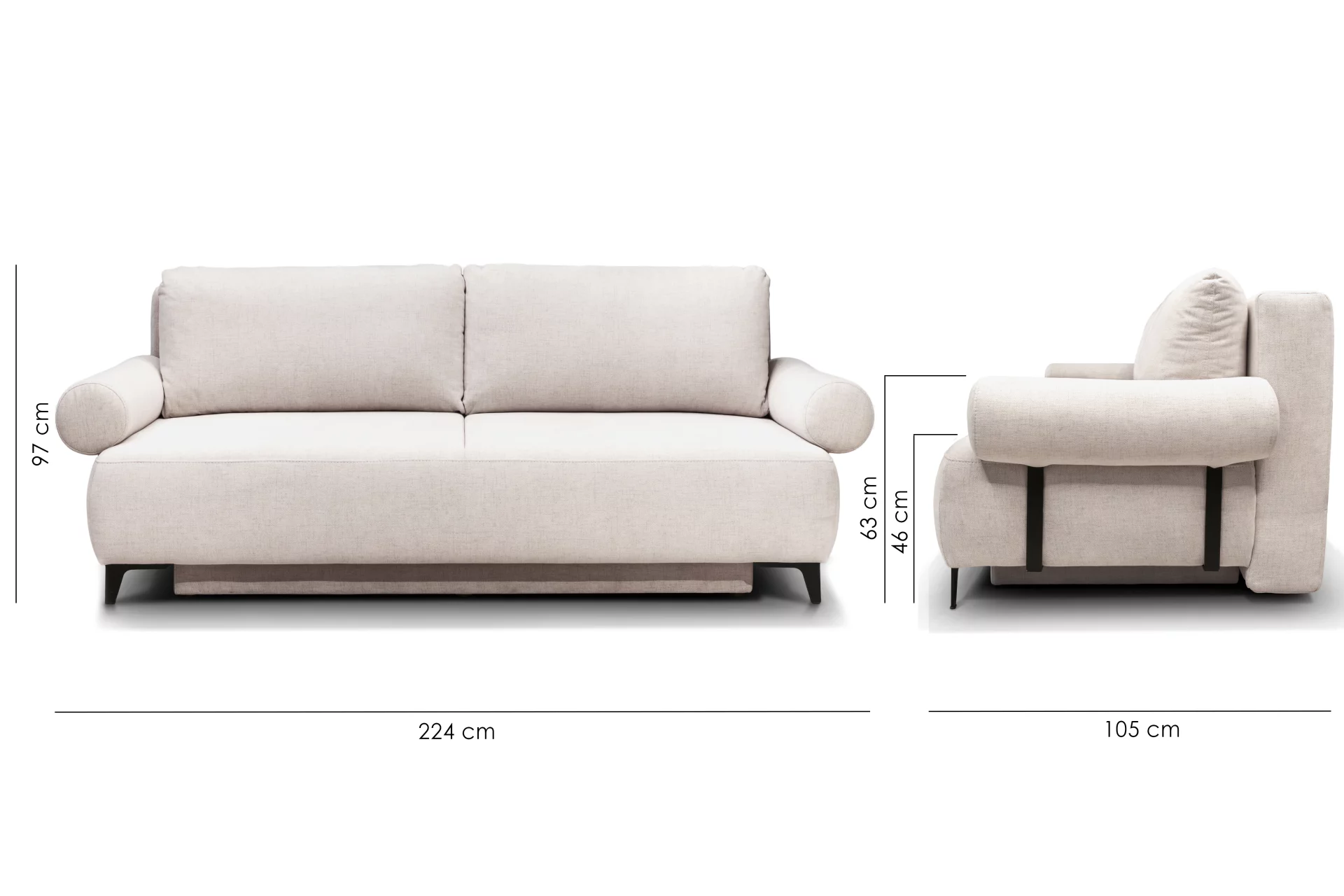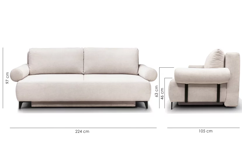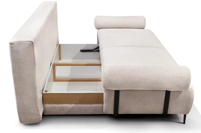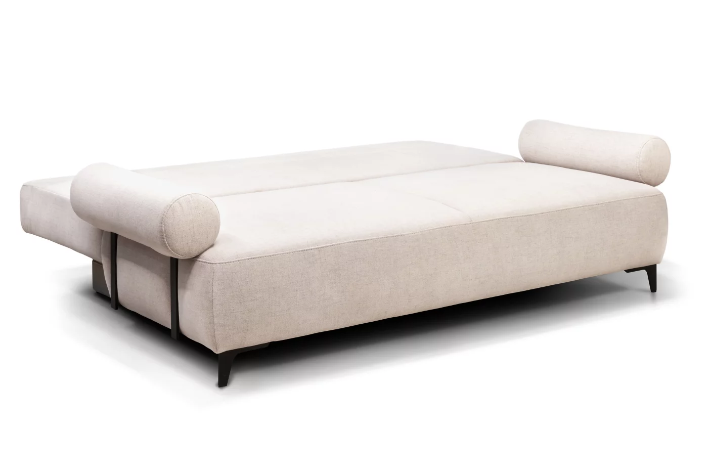 Бічні ніжки та ніжки переднього сидіння виконані з металу чорного кольору висотою, що надає виробу сучасного вигляду та елегантості. Ніжки контейнера, де ховається ніша для зберігання білизни, зроблені з пластику чорного кольору висотою 15 мм. Цей диван легко трансформується у комфортне спальне місце.