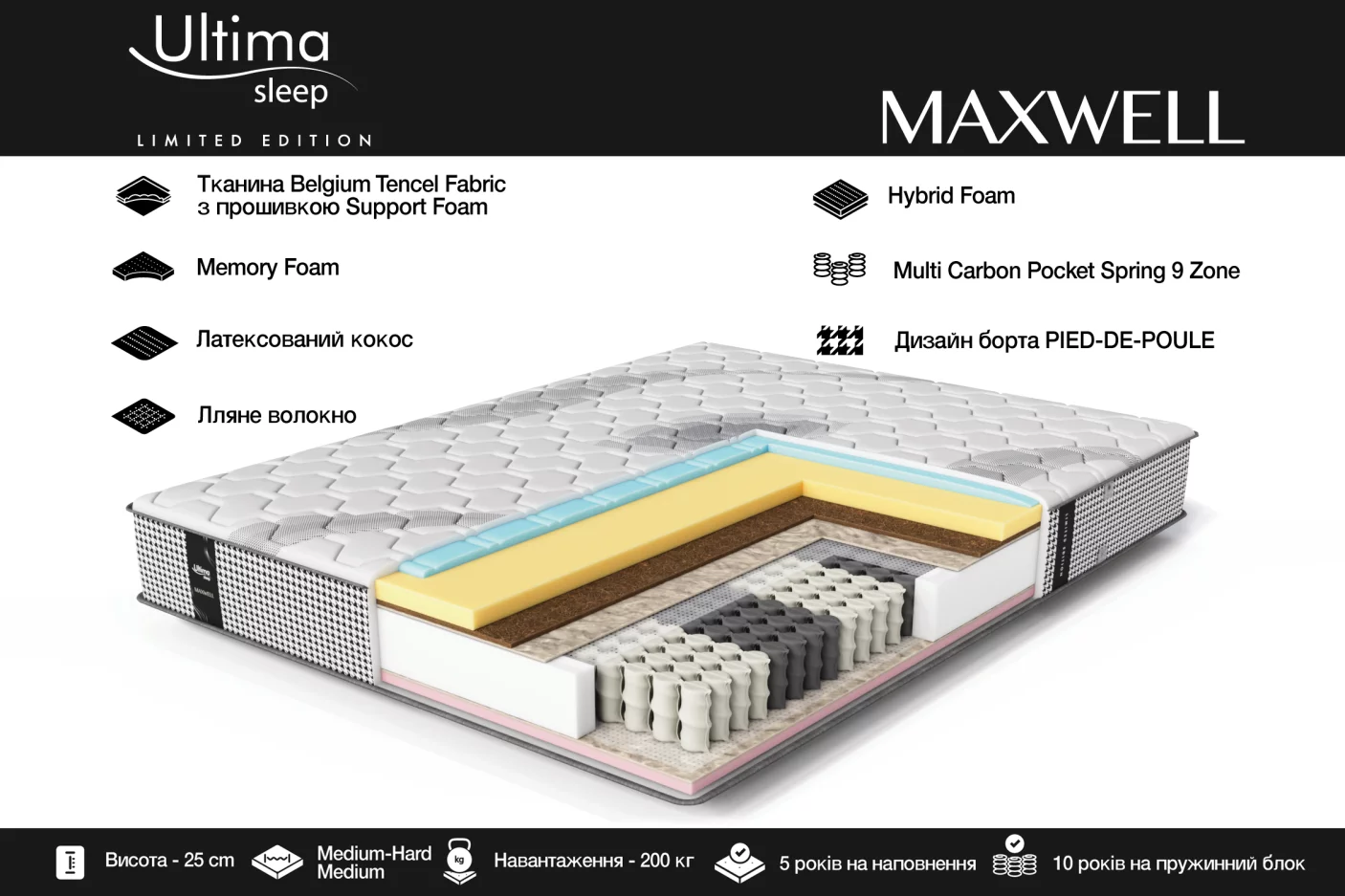 Чохол з тканини Belgium Tencel Fabric з прошивкою Support Foam додає елегантності та ніжності на дотик, а декоративний бортик з орнаментом Pied-de-poule підкреслює стильний і преміальний вигляд матраца.