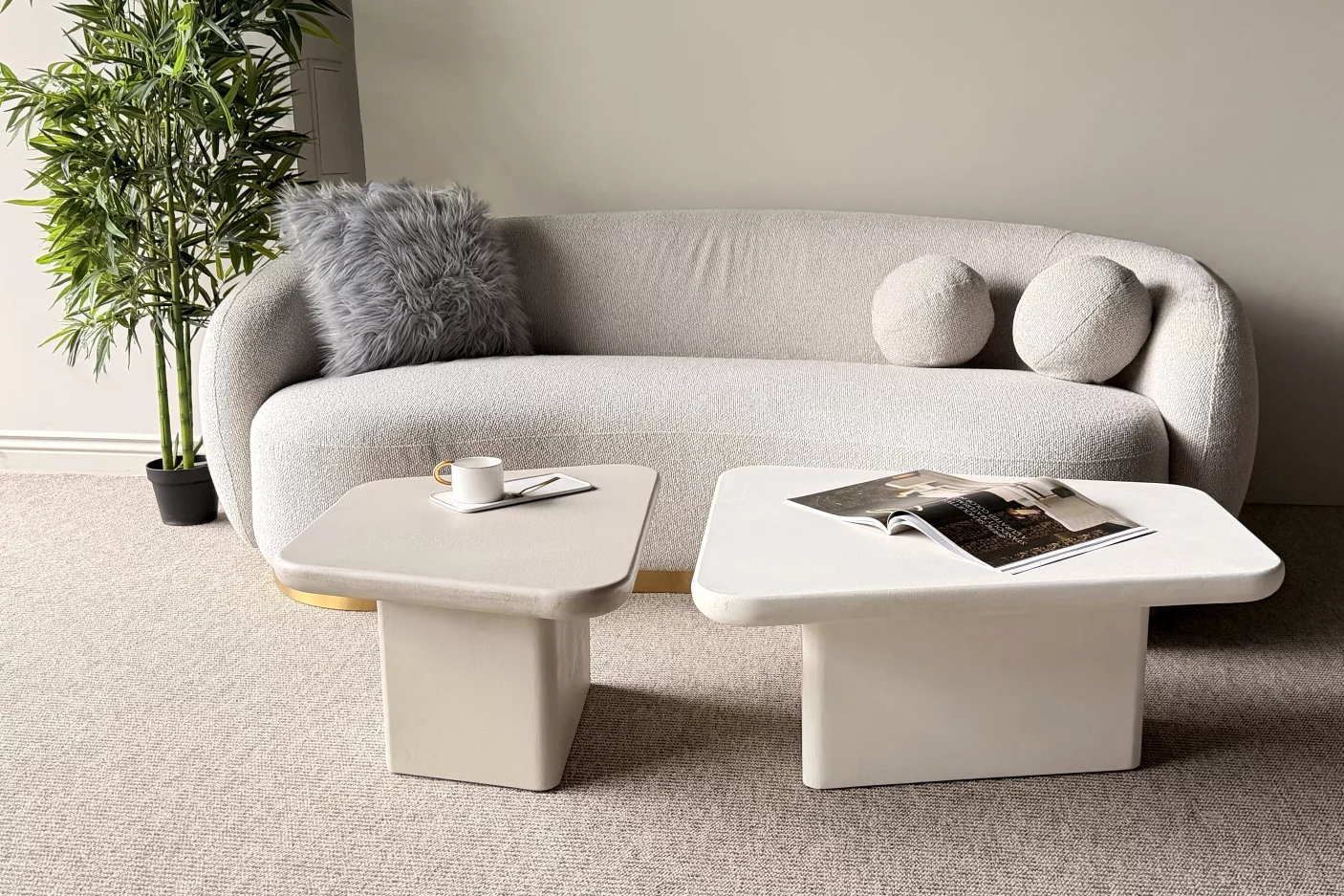 Оригінальний геометричний силует кавового столика складається з двох об'ємних блоків з легкого та мобільного композитного матеріалу, виконуючих ролі стільниці та основи. Така незвична, але проста форма впорядкує ваш простір, додавши в інтер'єр аскетичної привабливості.